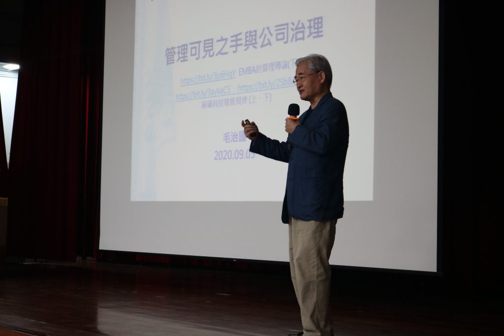 專題演講中,毛治國教授提出「可見之手與無形之手共舞」的管理觀點,「無形之手」為亞當斯密於1776年所提出的市場概念,而「可見之手」由哈佛大學教授錢德勒於1977年提出,指的是人為的管理。曾經無形之手是主導市場的唯一力量,到了1850年市場機制失靈後,出現可見之手的介入,毛教授認為,去中心化的無形之手與中心化的可見之手乃維持秩序的兩隻手,這兩股力量應以無形之手為主,可見之手為輔,具生命力的市場機制透由可見之手的輔助,便能自發出湧現新的有序結構與功能。而可見之手中系統、環境、領導人之間的關係,與佛家智慧的因緣關係有異曲同工之妙,因緣缺一不可成果。最後,毛教授亦提醒,作為無形之手的代理者,可見之手需要建立道德底線,以履行善良管理人的責任。
